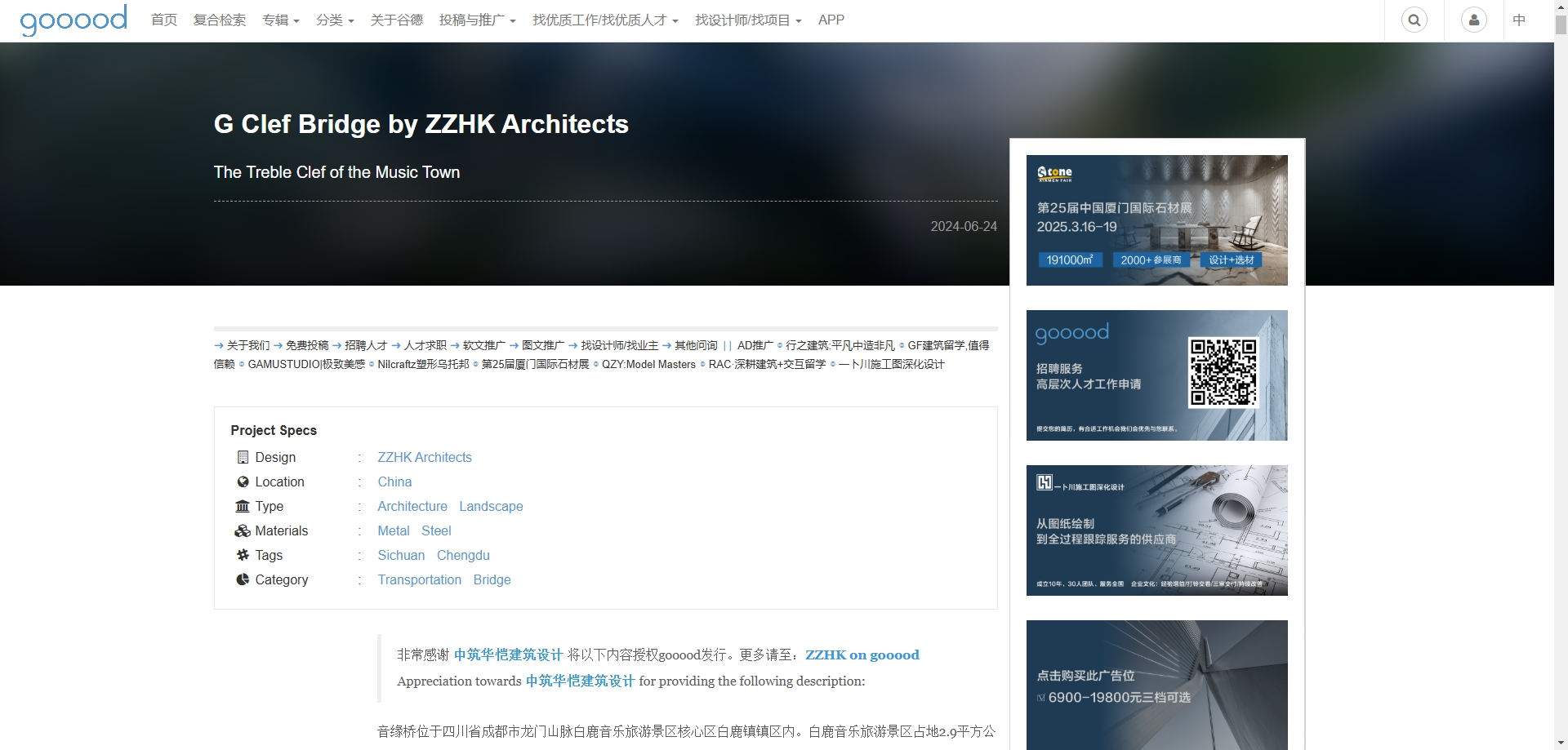 中国第一影响力与最受欢迎的建筑/景观/设计门户与平台-谷德设计网,将ZZHK Archìtects作品“音缘桥”作公众号头条项目发布