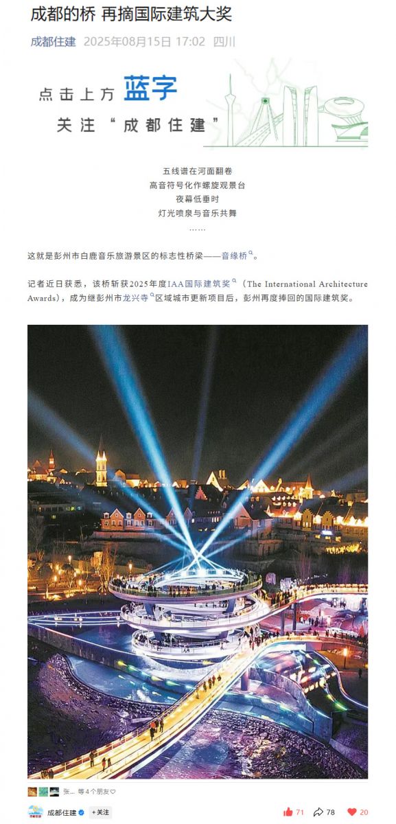 记者近日获悉,该桥斩获2025年度IAA国际建筑奖(The International Architecture Awards),成为继彭州市龙兴寺区域城市更新项目后,彭州再度捧回的国际建筑奖。