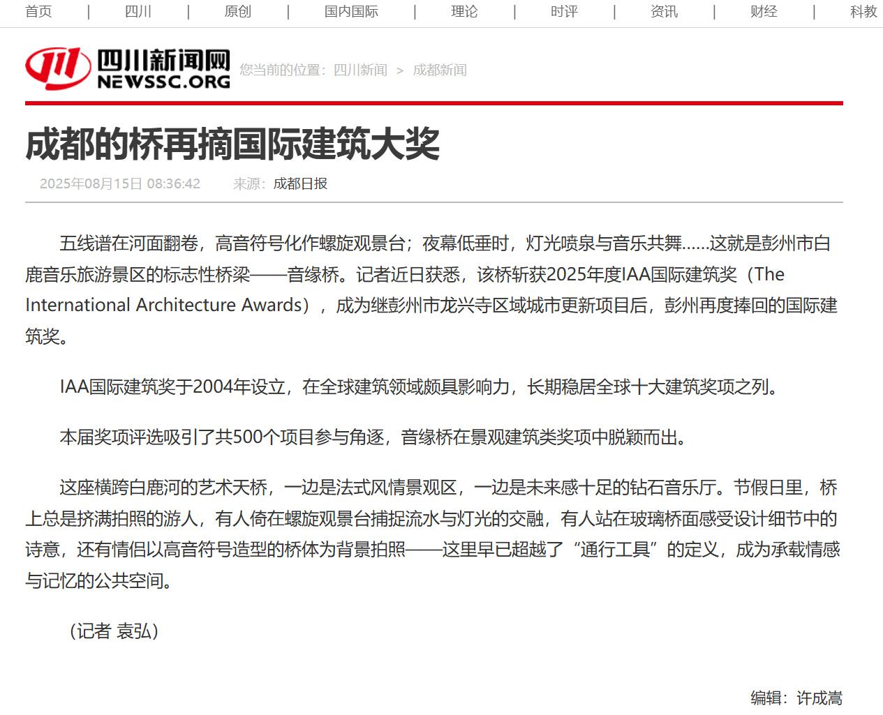 五线谱在河面翻卷,高音符号化作螺旋观景台;夜幕低垂时,灯光喷泉与音乐共舞……这就是彭州市白鹿音乐旅游景区的标志性桥梁——音缘桥。记者近日获悉,该桥斩获2025年度IAA国际建筑奖(The International Architecture Awards),成为继彭州市龙兴寺区域城市更新项目后,彭州再度捧回的国际建筑奖。