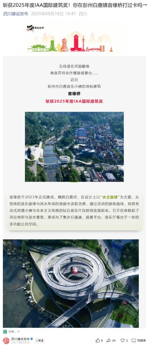 IAA国际建筑奖于2004年设立,在全球建筑领域具有广泛影响力,至今已举办二十一届,本届奖项吸引了共500个项目参与角逐,“音缘桥”在景观建筑类奖项中脱颖而出,并将在9月19日于希腊雅典开幕的“城市与世界”建筑展览上亮相,同时被收录进年度出版物《全球建筑与城市设计2025》。