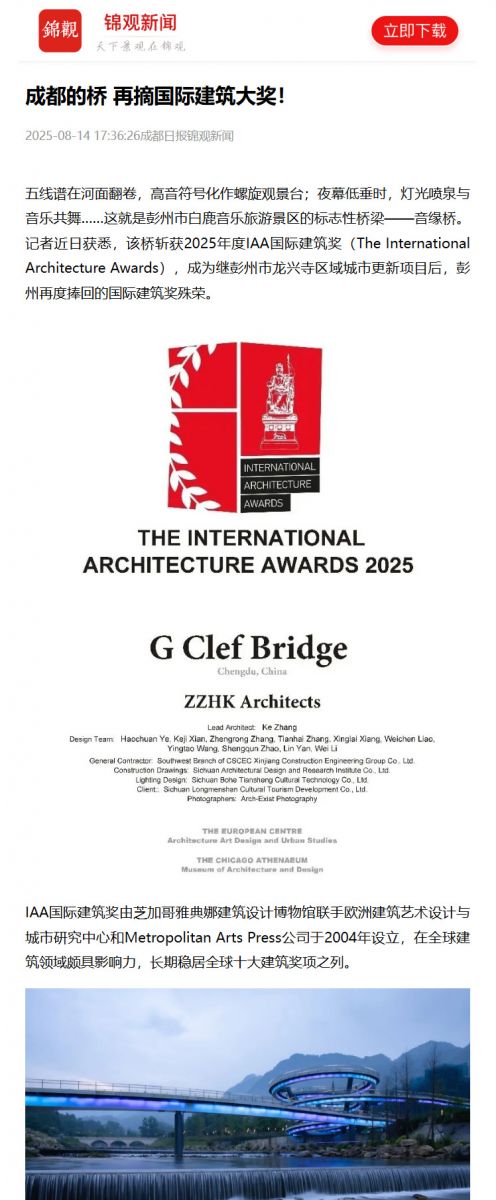 本届奖项评选吸引了共500个项目参与角逐,音缘桥在景观建筑类奖项中脱颖而出,并将在9月19日于希腊雅典开幕的“城市与世界”建筑展览上亮相,同时被收录进年度出版物《全球建筑与城市设计2025》。