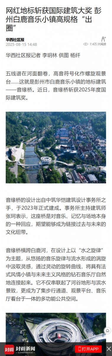 五线谱在河面翻卷,高音符号化作螺旋观景台……这就是彭州市白鹿音乐小镇的地标建筑——音缘桥。