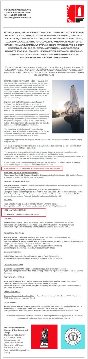 [2025年9月19日 · 希腊·雅典] —— 由中筑华恺建筑师事务所(ZZHK Architects)设计的《音缘桥》(G Clef Bridge),作为2025年国际建筑奖(The International Architecture Awards 2025)获奖作品,入选并亮相于“城市与世界”建筑展览(The City and The World)。展览于2025年9月19日至21日在希腊雅典卫城脚下盛大举行,汇聚来自全球50多个国家的年度最具变革力的建筑与城市规划项目,是本年度国际建筑奖系列活动的全球主场。