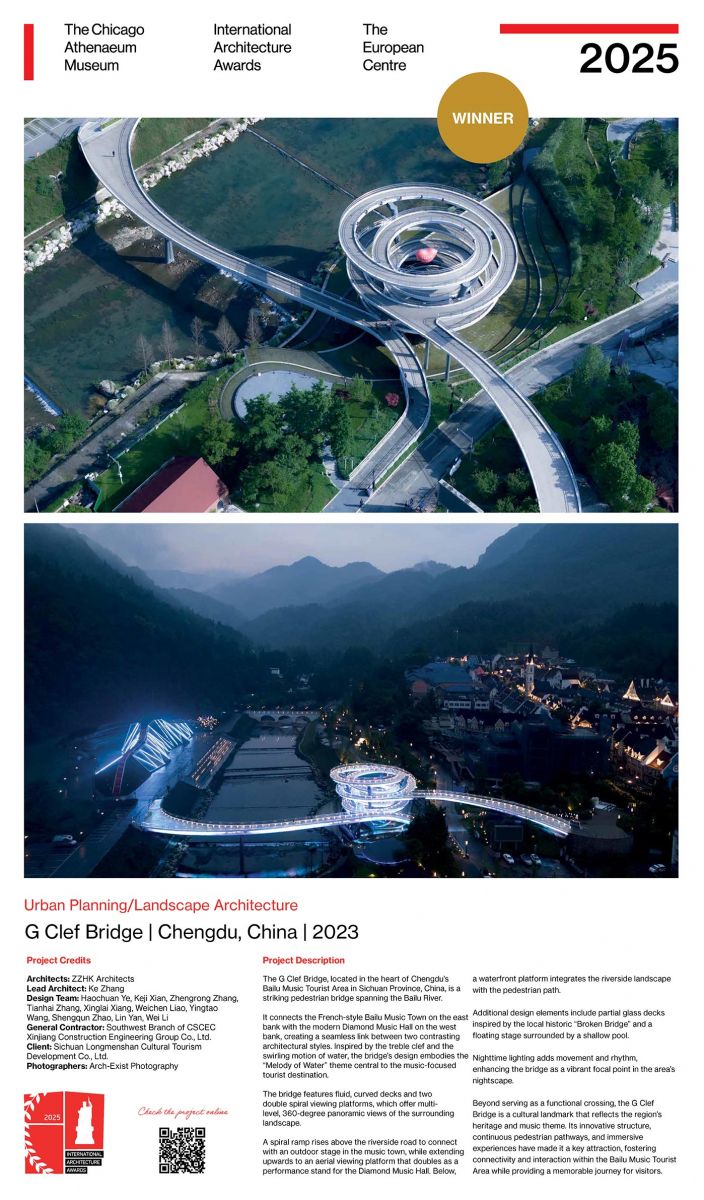 《音缘桥》作为连接四川白鹿音乐小镇与现代钻石音乐厅的地标性桥梁,以音符旋律为灵感,将结构艺术与公共空间叙事相结合,打造出一座融合山地地形、文化语境与当代设计语言的城市装置,具有鲜明的国际辨识度。其入选不仅是对项目设计价值的高度认可,也彰显了中筑华恺团队在桥梁美学与文化型基础设施领域的创新探索。